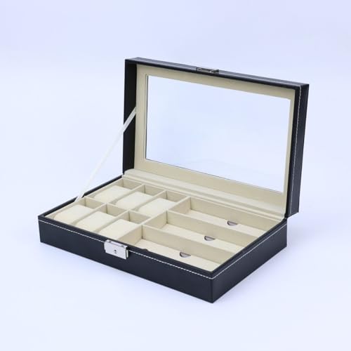 - COMPLETE LUXURIOUS ORGANIZATION: designed to solve the problem of chaos for good. With 9 firm and padded compartments, 6 of them are dedicated to securely and discrete storage your watches to prevent scratches and tangles, and 3 spacious and convenient compartments dedicated to protecting your sunglass and eyeglasses A comprehensive solution to organize your valuable accessories in one sleek, easy access place.