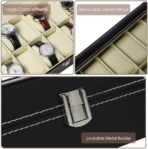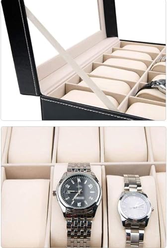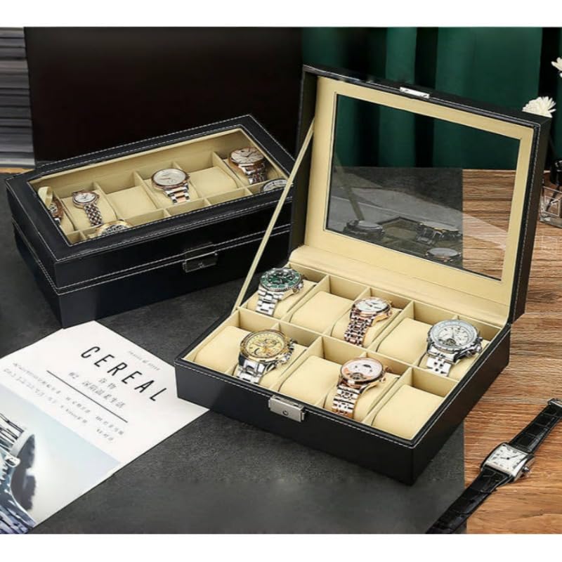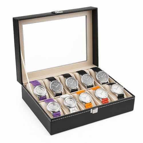 Daga - صندوق تخزين الساعات، صندوق منظم مع قفل وغطاء زجاجي، صندوق مقتنيات من الجلد عالي الجودة للرجال مع 10 فتحات، تصميم أسود أنيق ووسادة قابلة للإزالة