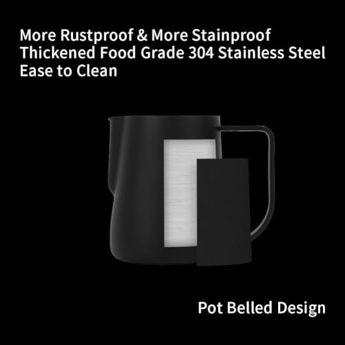 - MAKE PERFECT LATTE ART: Specially pot bellied design can rotate milk froth fully and make the fusion rate of foam thicker than ordinary pitcher. Short spout allow you to pour milk foam smoothly without overflow. Diversion groove design make it easier to create latte art for espress and cappuccino. The mouth of the milk frother cup is round, help milk to release in abundance, and make the second period of oscillation easier.