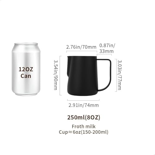 - PORTABLE CAPACITY: 8oz/250ml stainless steel milk frothing pitcher is perfect for 1 cup. Small steamer jug effectively save milk and avoid waste for one serving. Suitable for cups or glasses with a capacity of 200ml or less. Perfect for making coffee like dirty white. Measurement scale inside can help you control the amount. Max capacity is around 10oz.