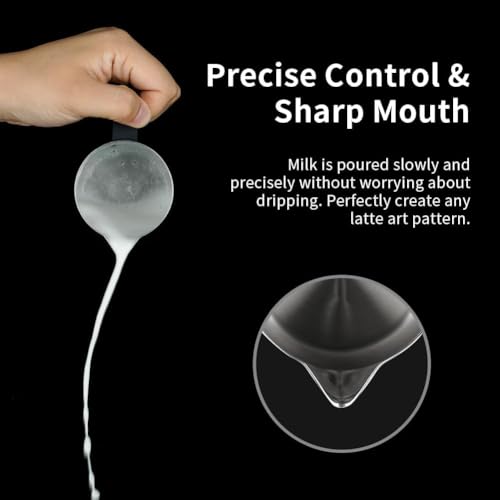 - ERGONOMIC HANDLE: The handle is welded into the body as a whole, without any traces of mechanical welding. The handle of the milk pitcher has been smoothly polished, providing a comfortable grasp for your latte art.