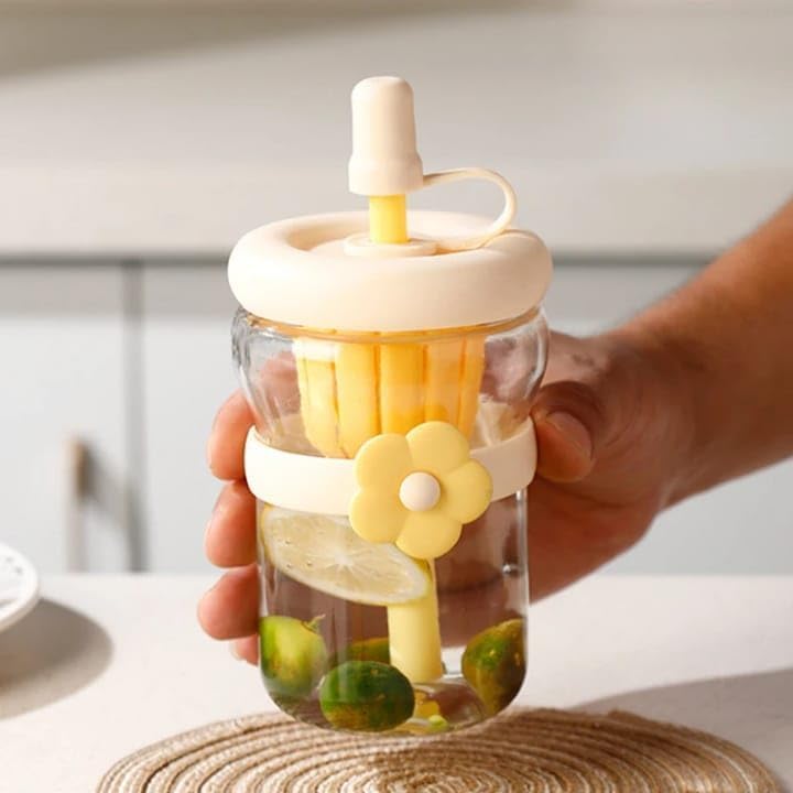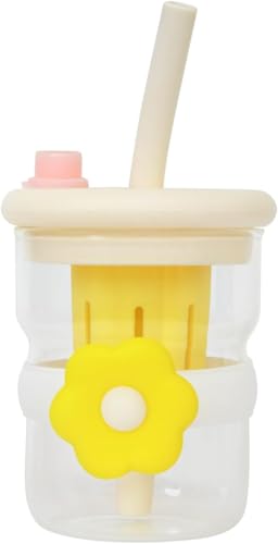 Generic - Water Bottle Glass with Straw 500ml - Cute Flower Strainer Cup Leak-Proof Bpa Free for Juice Milk Tea Indoor Outdoor, GG-2521 (Yellow)