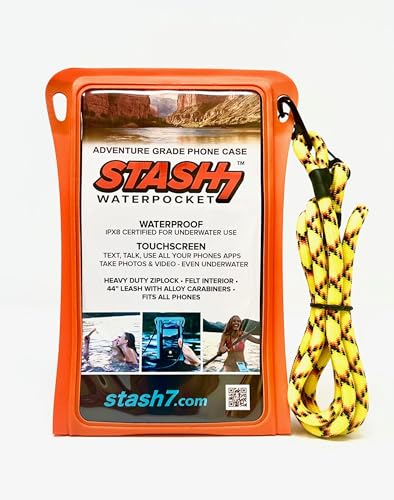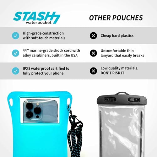 - 44" SHOCK CORD LANYARD: the Stash7 Waterpocket waterproof phone bag features the one and only Stash7 Leash: a rugged 40" UV and abrasion resistant, nautical grade shock cord with a sturdy alloy spring loaded carabiners letting you securely clip, loop or tie your phone pouch in any way you want to your life jacket, belt, backpack, swimsuit, or whatever gear your taking on your next adventure