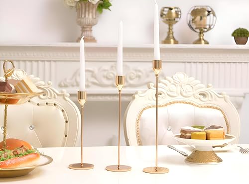 - Set of 3 metal candle holders in three different heights (9.4, 11.4, and 13.4 inches), designed to fit candles of 0.86-inch diameter, offering a refined layered decoration effect for tables and events.