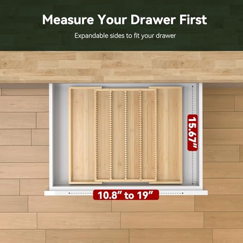 - 【𝗙𝗶𝘁 𝗬𝗼𝘂𝗿 𝗗𝗿𝗮𝘄𝗲𝗿 𝗣𝗲𝗿𝗳𝗲𝗰𝘁𝗶𝗹𝘆】Expandable from 10.8 inches to 19 inches wide,15.67 inches long and 1.9 inches height,easy to install just place inside drawer and expand or set in top of the counte