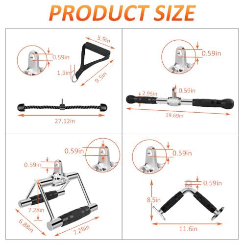 - A Full Set Cable Machine Attachments: Multi accessories allow you to isolate each muscle group to the fullest. Perfect for lat pulldowns, cable curl bars, triceps press downs, straight bar curls, seated rows, building stronger triceps and grip strength, assisting muscles around elbows, wrists, back, abs and shoulders, leg, hip abductors and glute workouts.