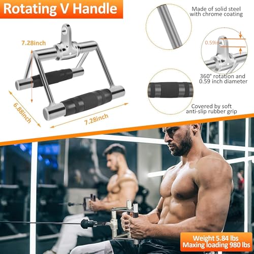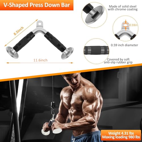 - 360-Degree Swivel Straight Lat Pull Down Bar & V Bar: These bars are made of quality solid steel with polished chrome, 0.6 inch hole can fit for most cable system easily. Textured rubber-coating handles enable ergonomic and firm grip during exercise. Weight capacity can be up to 980 lbs.
