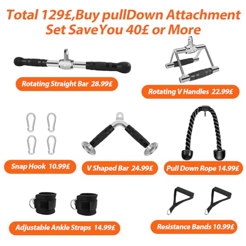 - Multi Gym Cable Attachments Set: It comes with 1*Rotating Straight Bar + 1*V Shaped Press Down Bar + 1*Rotating V-Shaped Handle + 1*Triceps Rope + 2*Ankle Straps + 2*Resistance Band Handle Exercise Handles + 4*Carabiner Clips.