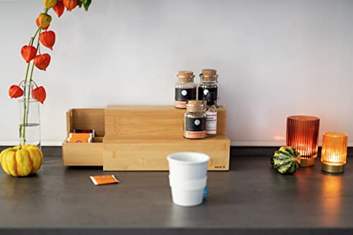 - منظم البامبو العملي بالتصميم المتدرج للقهوة والشاي يضفي تنظيمًا إلى خزانة المطبخ أو سطح العمل.