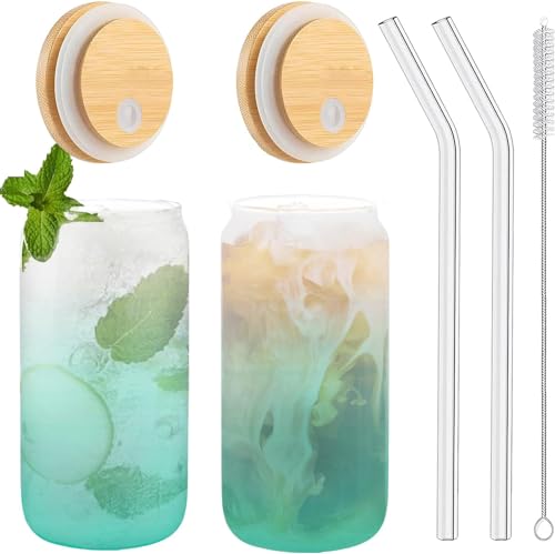 WEZOSHINET - Can Shaped Glass Drinking Glass with Bamboo Lids Glass Straw Temperature Resistant Drinking Glass Tumbler Cups for Beer, Juice, Soda, Coffee, Smoothie, Cocktail, Whiskey (Pack of 2)