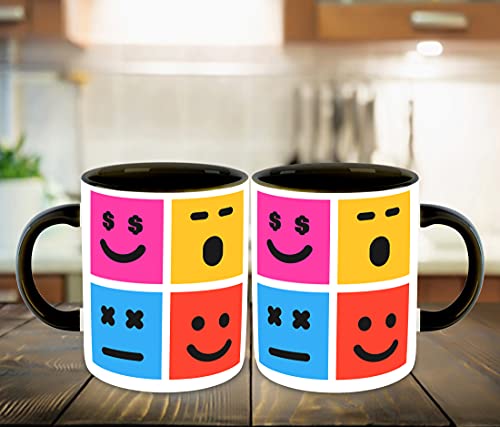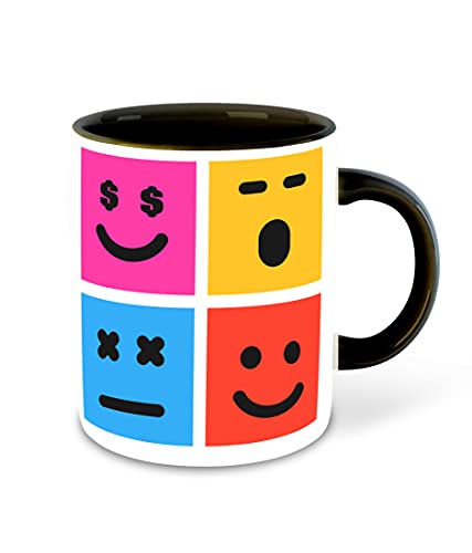 WHATS YOUR KICK - مج قهوة سيراميك مطبوع بنمط رموز تعبيرية لطيفة، مج عيد ميلاد بتصميم وجوه رموز تعبيرية لطيفة من واتس يور كيك®، أسود، تصميم 3
