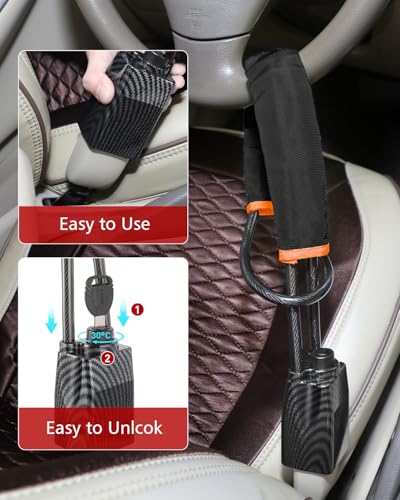 - High-strength braided steel wire and PVC outer layer: premium materials make this car lock more durable. The anti-theft device for steering wheel lock is made of high strength braided steel wire, 50g heavier than other products, able to withstand higher tensile and shear forces, resulting in superior strength and flexibility. The smooth water transfer printing process reduces friction on your seat, while the braided steel wire outer layer with high quality PVC helps prevent steering wheel wear and rust.