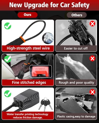 - Universal, suitable for most car models: this car steering wheel lock has a sufficiently long and adjustable cable to securely lock the steering wheel and seat belt buckle. If the length is not enough, simply move the car seat and adjust it to the appropriate position. It is compatible with most car models on the market, so you don't have to worry about compatibility problems. Improved anti-theft protection and universality give you more security