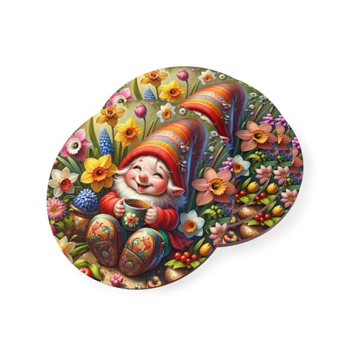 Generic - Whimsical Garden Gnome Floral Coaster – Cute Elf with Coffee Surrounded by Spring Flowers – Round Drink Coaster for Home or Office Decor Rubber Coaster Set Heat-Resistant & Durable - Set of 4