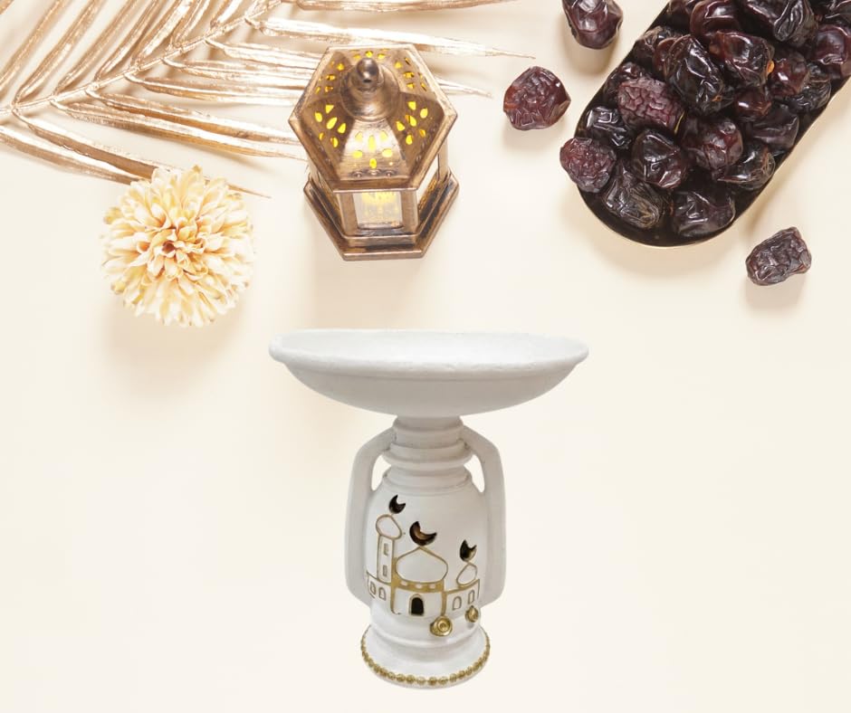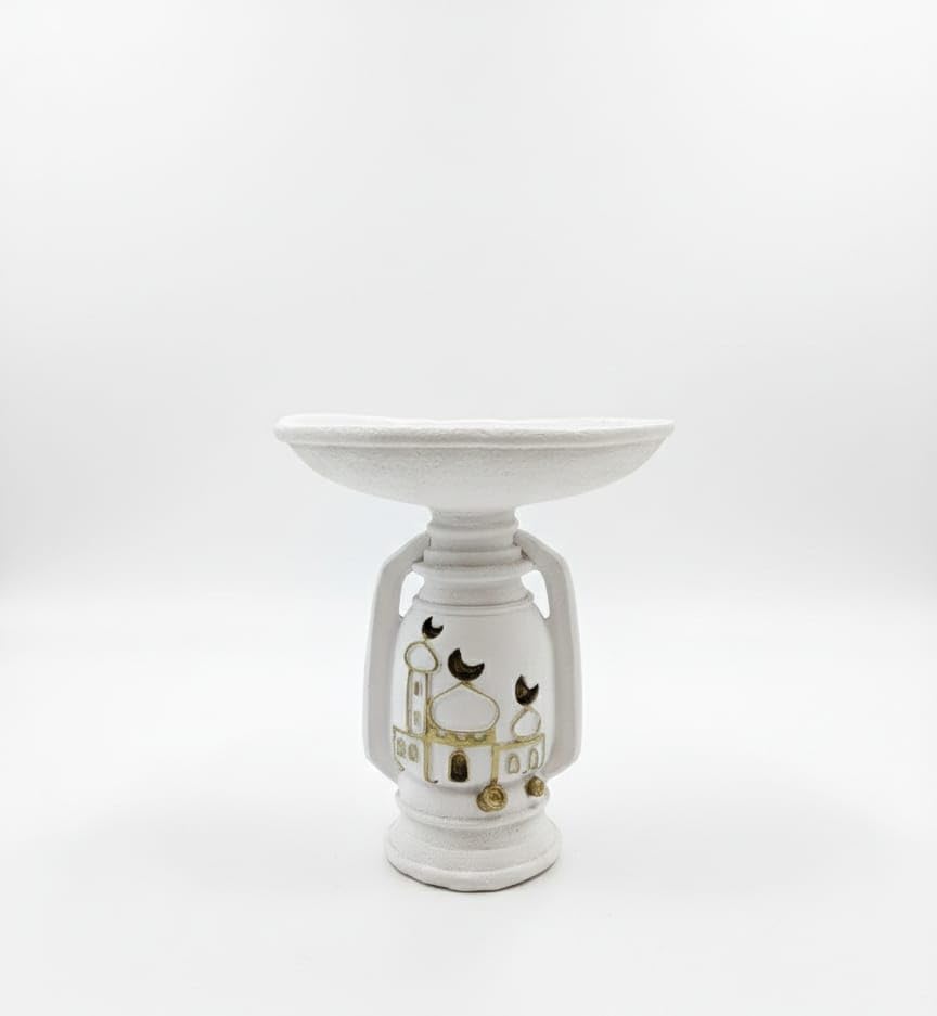 - تصميم إسلامي مميز: فانوس سيراميك أبيض بتصميم مسجد إسلامي أنيق مع نقوش ذهبية فاخرة تضفي لمسة روحانية على المنزل