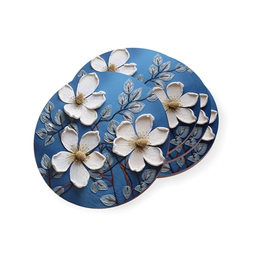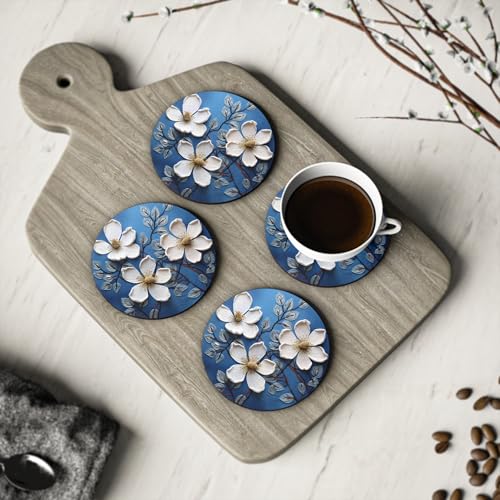 Generic - White Floral Drink Coasters for Kitchen & Home - Decorative Rubber Coasters – Round Drink Coaster for Home or Office Decor Rubber Coaster Set Heat-Resistant & Durable - Set of 4