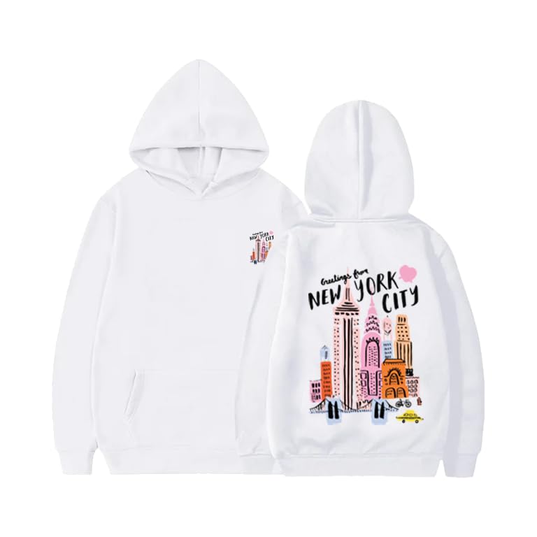 Generic - سويت شيرت بغطاء راس ابيض مع طباعة جرافيك مدينة نيويورك، سويت شيرت بلوفر بغطاء راس مقاس (S)