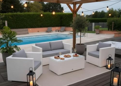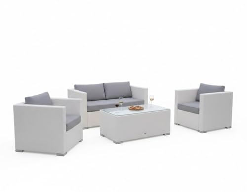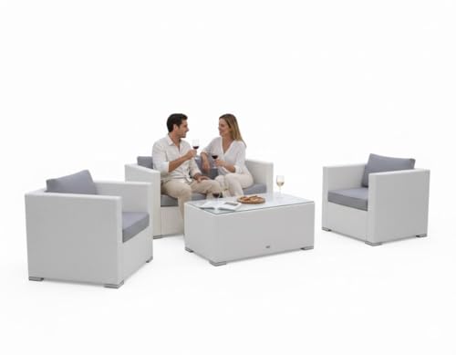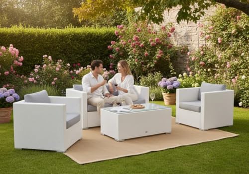 Generic - White Rattan Outdoor Patio Furniture Set, 4-Piece with Sofa, 2 Chairs, Coffee Table, Grey Cushions, Metal Frame