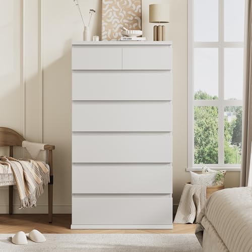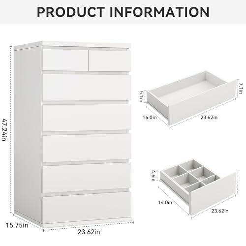 Jocoevol - White Tall 7 Drawer Dresser for Bedroom, Modern Wood Closet Dressers & Chests of Drawers with Jewelry Storage, 23.6" L*15.8" W*47.5" H in Large Vertical Dresser for Bedroom, Living Room, Nursery