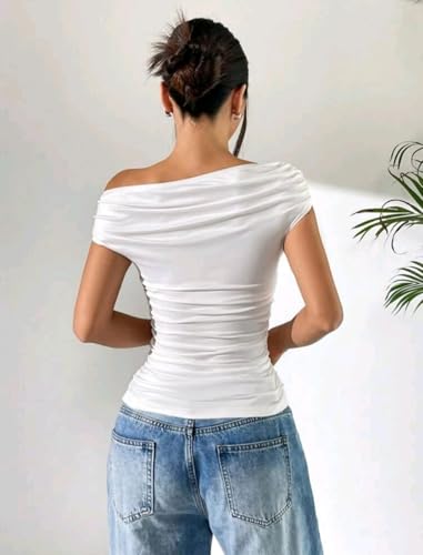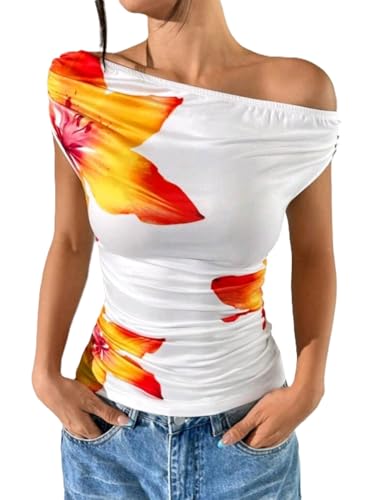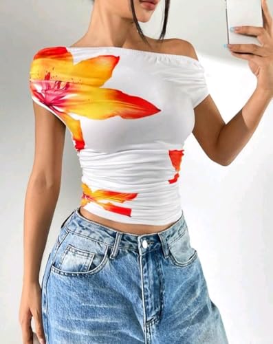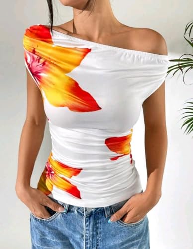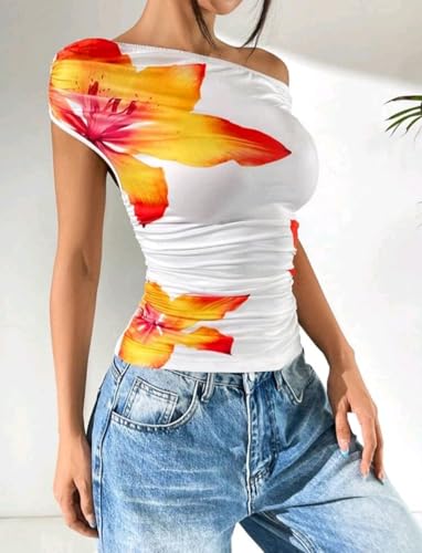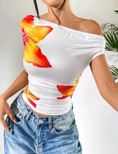 Generic - بلوزة نسائية البيضاء المحبوكة ذات الكتف الواحد والمزينة بطبعة زهور استوائية نابضة بالحياة
