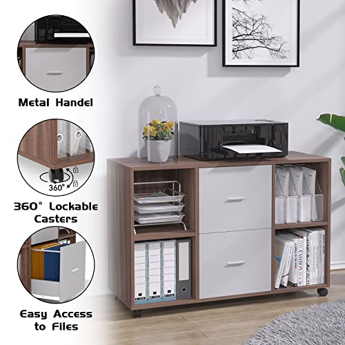 WILLIAMSPACE - Williamspace File Cabinet for Home Office Filling Cabinets with 2 Drawer & 4 Shelves, Large Mobile Printer Stand with Storage Cabinet on Wheels (Walnut + Grey)