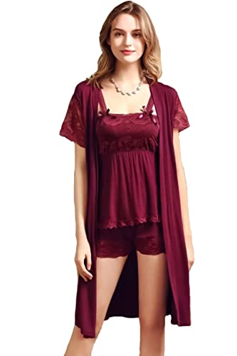 Generic - Wine Top Cotton Robe and Shorts with Lace Trim Lingerie Set