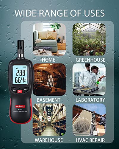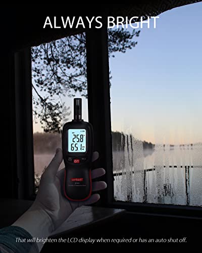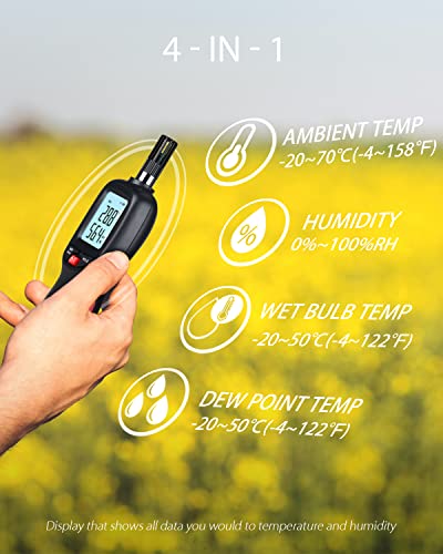 Wintact - مقياس حرارة رقمي لقياس الرطوبة بإضاءة خلفية، مقياس درجة الحرارة والرطوبة، والندى ودرجة حرارة المصباح الرطب مع توضيح الحد الأقصى والحد الأدنى، مع إمكانية حفظ البيانات، البطارية مرفقة