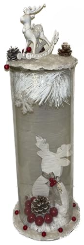 - عناصر التصميم: تتميز بتماثيل الرنة البيضاء وأكواز الصنوبر والتوت الأحمر الاحتفالي مرتبة في مشهد شتوي أنيق