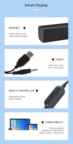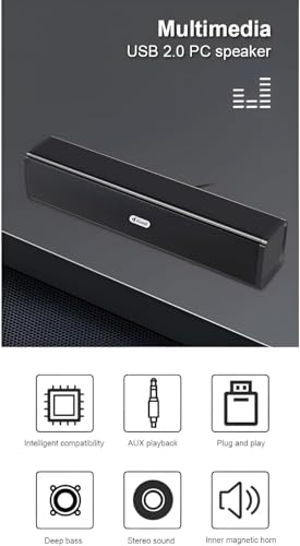 Generic - مكبر صوت سلكي للكمبيوتر بمنفذ USB، نمط ساوند بار، يتميز بصوت قوي وواضح، مدعوم بكابل USB ومقبس صوت للصوت