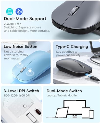 - 【Dual Mode Wireless Bluetooth Mouse】: Switch easily between two devices—connect one via Bluetooth (BT5.2/3.0) and the other using a 2.4G USB receiver. No drivers needed; just plug and play. Enjoy a reliable connection up to 33 feet. Note: You can't use both modes simultaneously; the USB receiver is stored in the mouse.