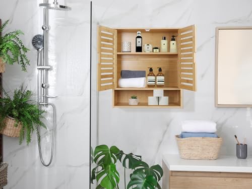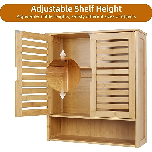 Wisfor - Wisfor Bathroom Wall Cabinet Storage: Bamboo Medicine Cabinets Wall Mounted Shelves Over Toilet Storage Organizer with 2 Doors Adjustable Shelf Magnetic Lock