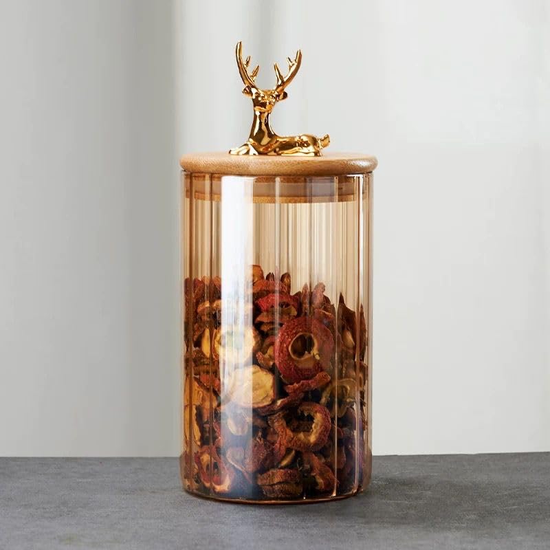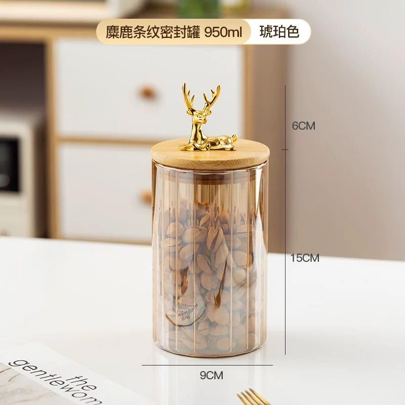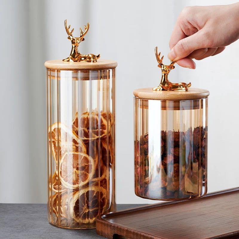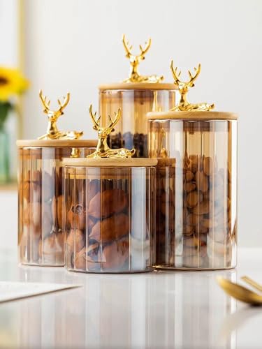Generic - With Deer Bamboo Lids, Clear Amber Glass Food Jars with Airtight Lid, Kitchen Storage Containers for Candy, Rice, Cookie, Pasta, Cereal (950ml)