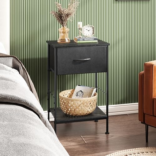 - SPACIOUS STORAGE SPACE: While the end table is cute, it suprisingly has room for a lot. The bedside table has 1 drawer for hidden storage and 2 spaces for open storage. The fabric bin is perfect for private things and the top and the open shelf for lamp,clock, books, etc.
