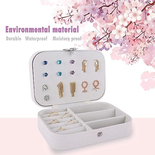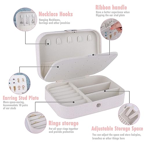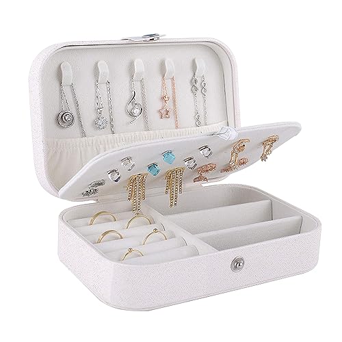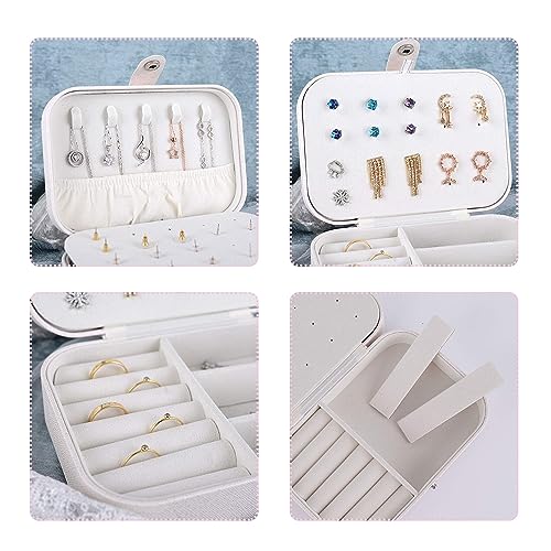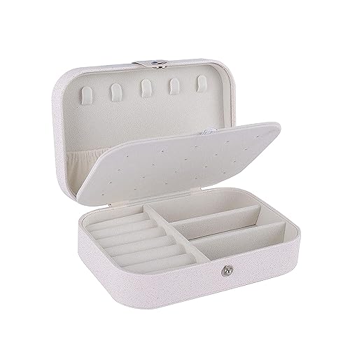 - [Practical Design] - Small but Large Capacity Jewelry Case with Double Layer, Provides Stud Plate, Necklace Hooks, Ring Groove and Adjustable Storage Space. Bottom Part Has 7 Ring Rolls for Rings, Earrings, Studs; 2 Cross Bar Dividers Offer 3 Small Compartments and is Removable for Holding Bracelets; The Middle Section can Hold 10 Pairs Earrings; Top Lid Section has 5 hooks and 1 Lower Elastic Pocket to Keep Necklace, Bracelets; Can Organize Most of Your jewelry and Cosmetic, Perfectly in Place