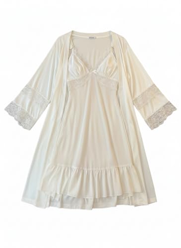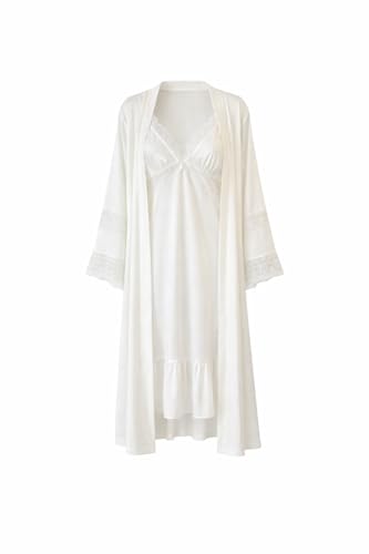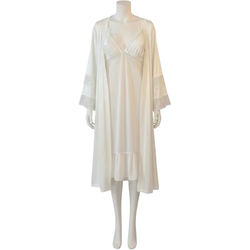 Generic - ثوب نوم ناعم مع روب للنساء - قطعتين من فستان نوم حريري بحواف من الدانتيل، روب حريري باكمام طويلة، اسود