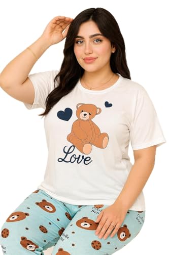 Generic - بيجامة حريمي قطعتين–مطبوعة بدب الكوكيز، طقم قطعتين، تي شيرت أبيض مع بنطلون أزرق فاتح، تصميم لطيف للنوم والراحة
