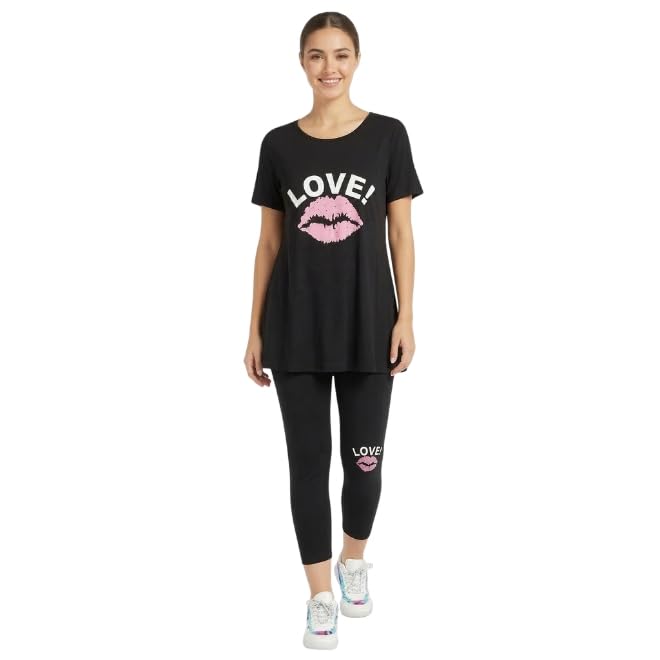 Generic - Women's 2 Piece Set Short Sleeve T-Shirt and Leggings, Cotton and Polyester, Black with Love Print and Pink Kiss, One Size Up to 75K Daily Wear and Sport