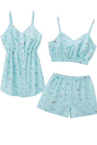 Generic - Women's 3 Piece Cash & Shorts & Bra, Light Blue, Feather Pattern Button Front Lingerie Set Cash & Shorts & Bra