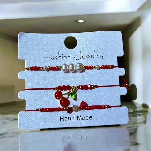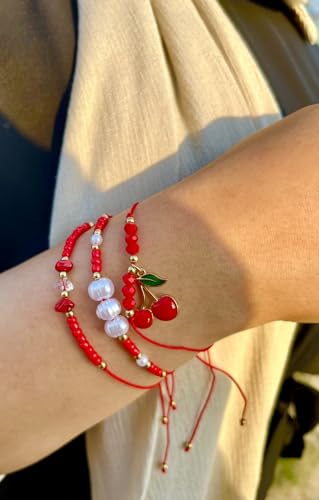 cherry accessories - Women's 3-Piece Red Beaded Bracelet Set - Cherry Charm & Faux Pearls - One Size Fits