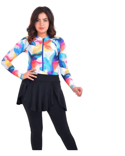 Generic - Women's Athletic Skort Set with Floral Print Zip-Up Top, Long Sleeve Workout Outfit, Black and Multicolour