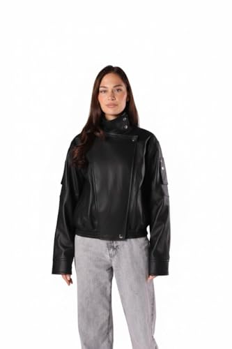 Generic - Women's Black Faux Leather Jacket, High Neck, Bomber Style, Ribbed Hem