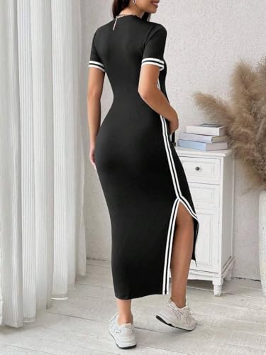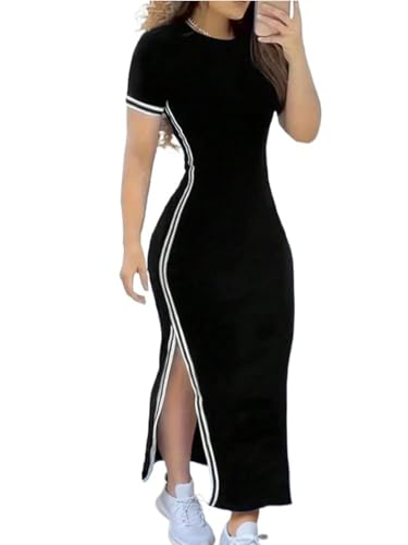Generic - فستان نسائي طويل أسود، أكمام قصيرة، خطوط جانبية بيضاء، فتحة جانبية، كاجوال - فرى سايز - موديل رقم #: 554B