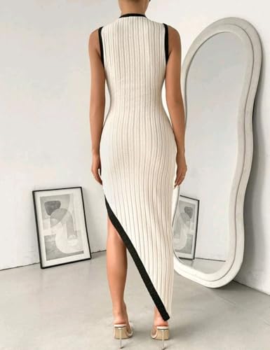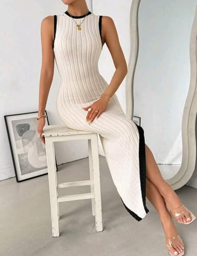 Generic - Women's Casual Solid Split Knee Round Neck Maxi Dress Morning Evening Dress Color:Beige