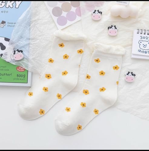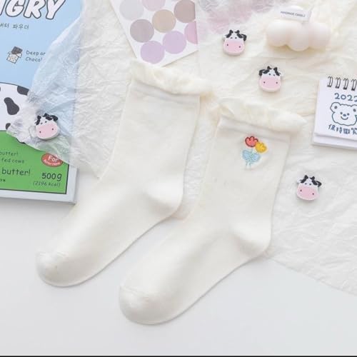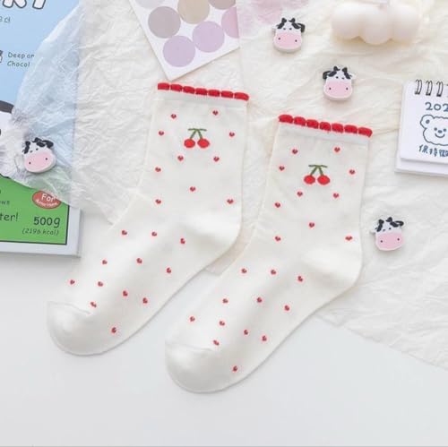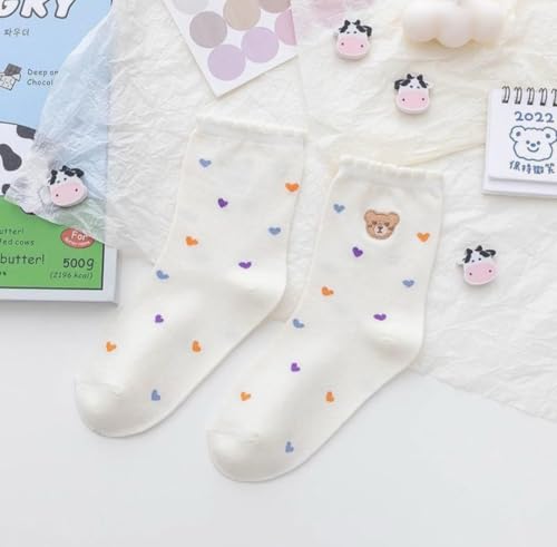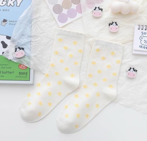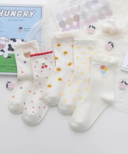 عام - Women's Cotton Crew Socks, White with Black Bows and Polka Dots Pattern, 5 Pairs