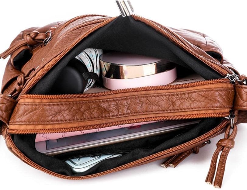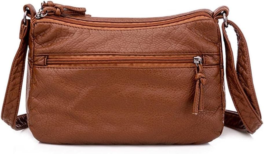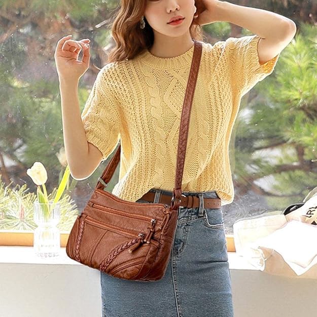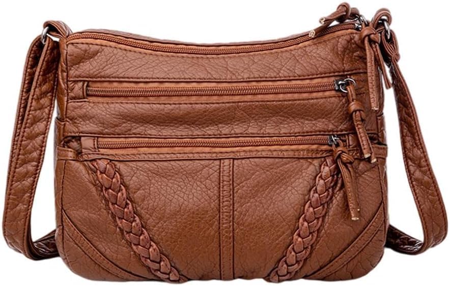 عام - Women's Crossbody Shoulder Bag, Brown Faux Leather, Multi-Zip Compartments, Braided Detail