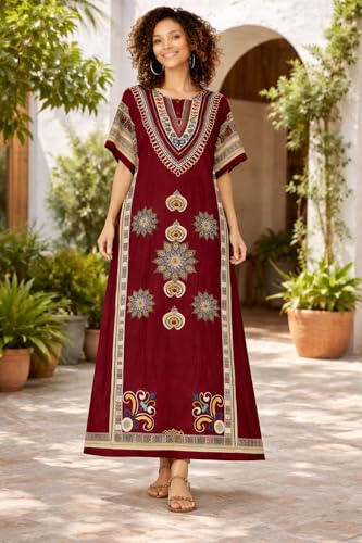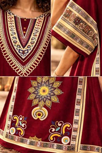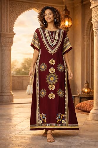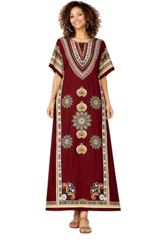 Generic - فستان ماكسي بطبعة داشيكي للنساء، احمر بورغندي، كم قصير، نمط قفطان افريقي تقليدي، نمط زهور مطرز