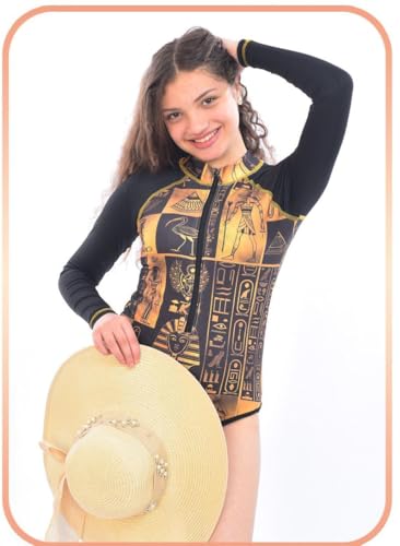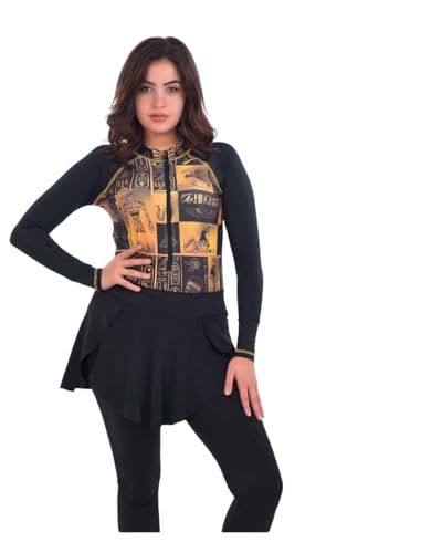 Generic - Women's Egyptian Print Long Sleeve Swimsuit, Black and Gold Hieroglyphic Pattern, Skirted Bottom