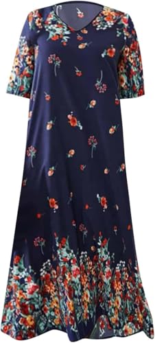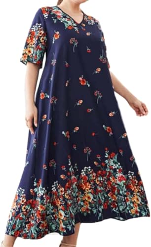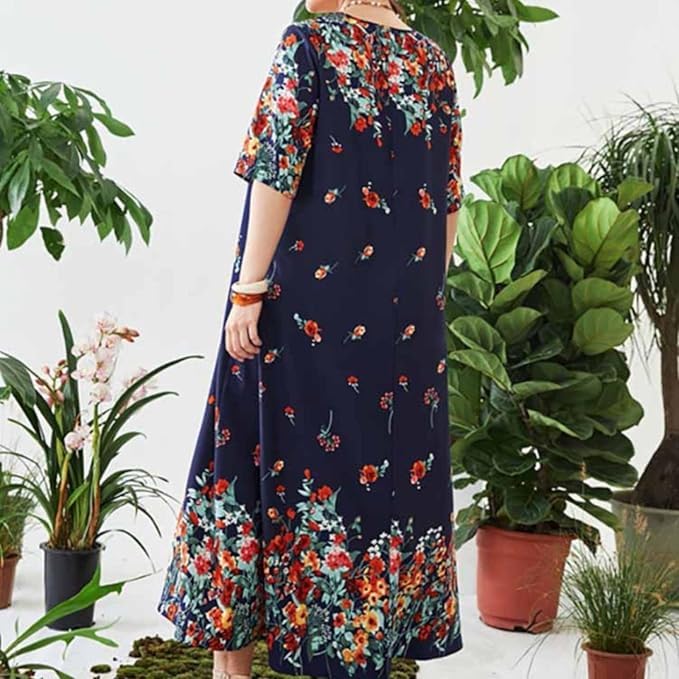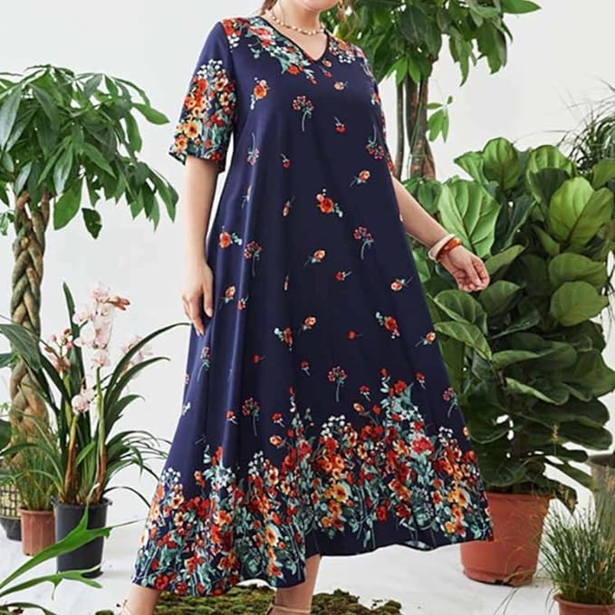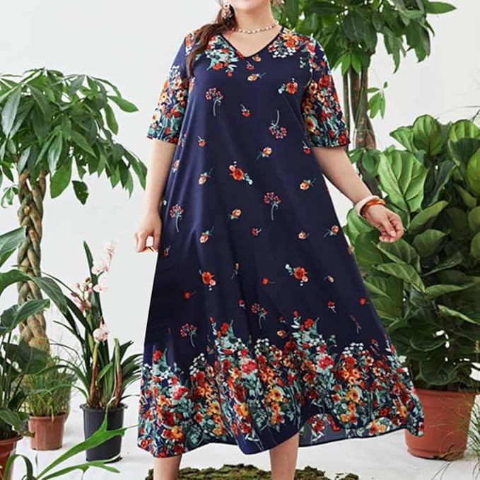 Generic - Women's Floral Long Dress Cotton Lycra Print Sublimation Loose Comfortable Big Size Dress Daily Outwear – Women Floral Maxi Dress Cotton Lycra Plus Size