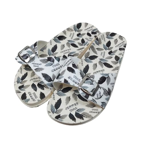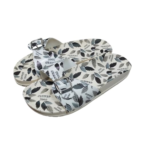 Generic - Women's Floral Print Rubber Slide Sandals, Black and White Leaf Pattern, Adjustable Buckle Design, Casual Summer Footwear Size 39 - شبشب مطاط حريمي