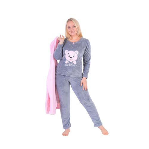 Dadoush - بيجاما نسائية فراء ناعمة ودافئة، طقم من 3 قطع بتصميم دب، رمادي، ملابس نوم شتوية,بيجامة حريمي مصنوعة من الفرو الناعم
